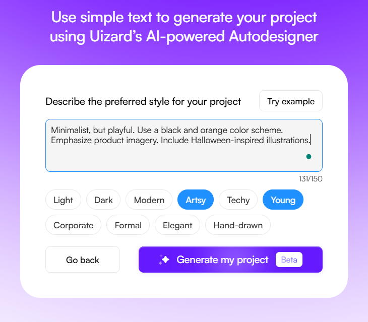 That said, include a few extra details about your project's overall look and feel. You can also select between various pre-defined design styles.