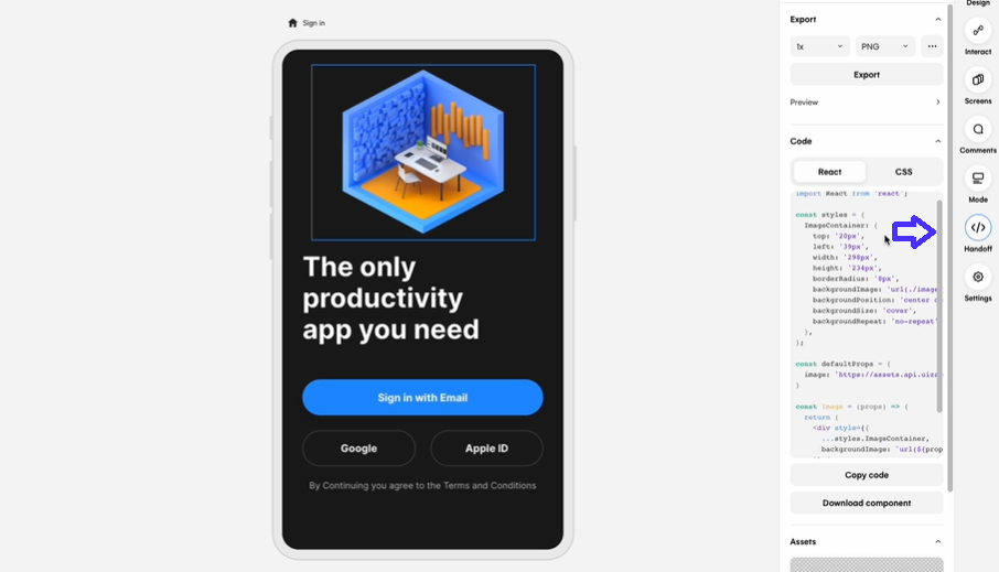 Lastly, you can use the Handoff feature to visualize and copy each design element's React and CSS code.