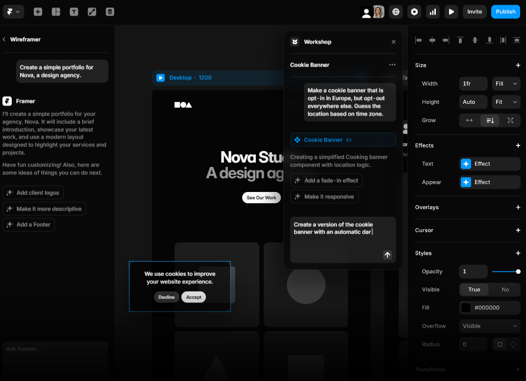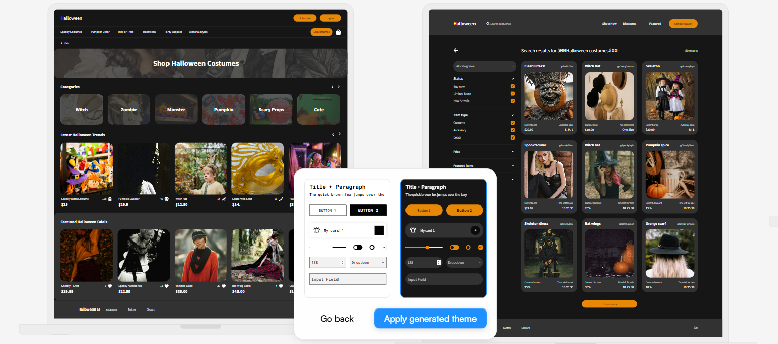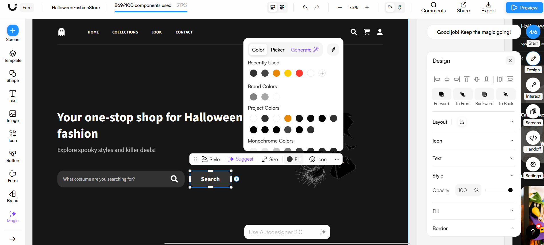 Next, use the editing canvas to adjust the generated designs to your needs. You can also use the theme generator to fix project-wide inconsistencies.