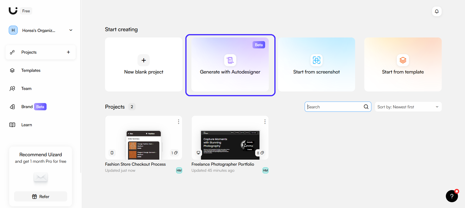 Note: The Uizard free plan only includes access to Autodesigner 1.5, an older version of the platform's generative AI. The latest version, Autodesigner 2.0, is only available in paid plans.