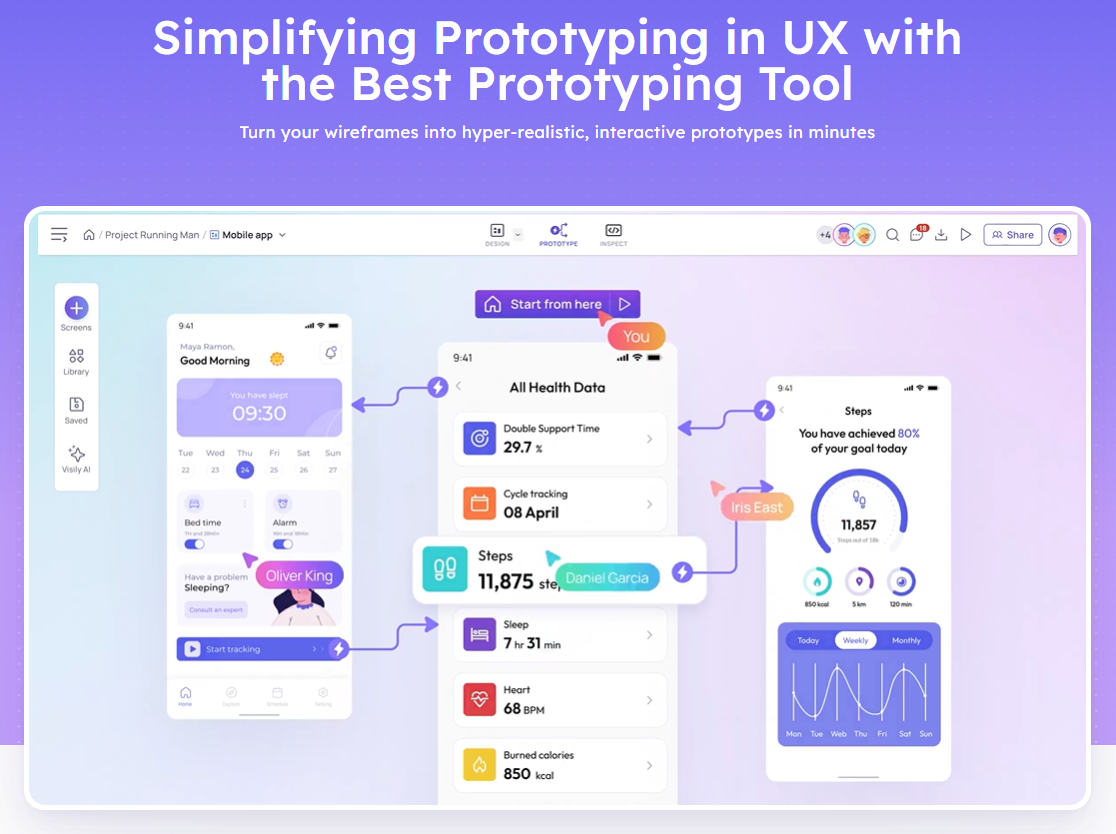 - Wireframing: Generate both low and high-fidelity wireframes within a few clicks. Visualize screen flows and turn wireframes into interactive prototypes in the same dashboard.
