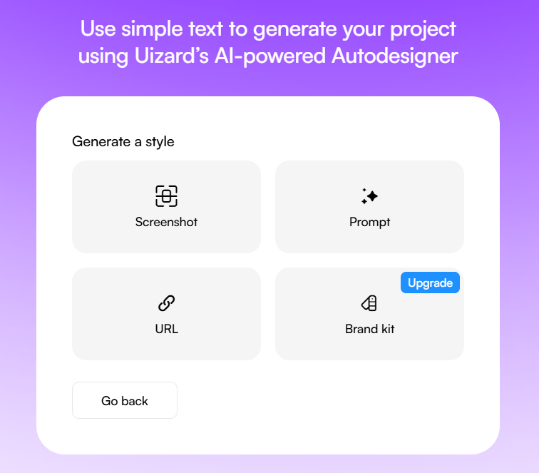 After that, you'll have to select how you would like the platform to generate the output—via an additional text prompt, screenshot, or URL. You can also generate designs based on brand kits if you have one of the top-tier plans.