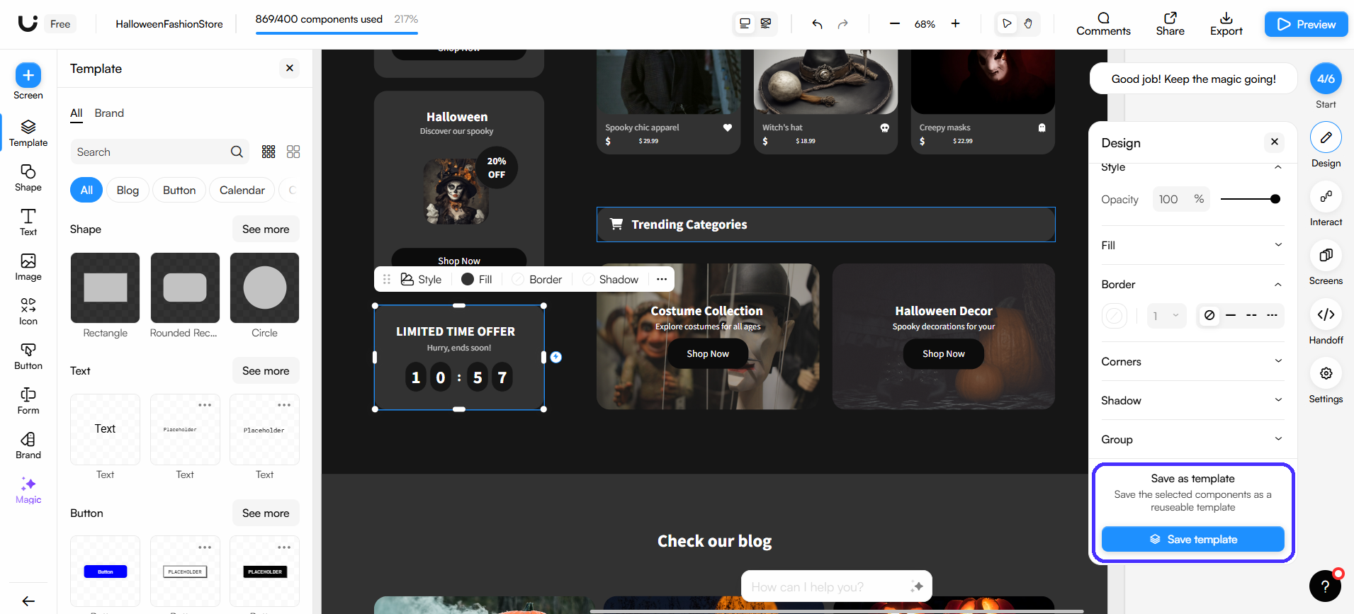 You can also click on specific components and save them in the platform's template library for later reuse.