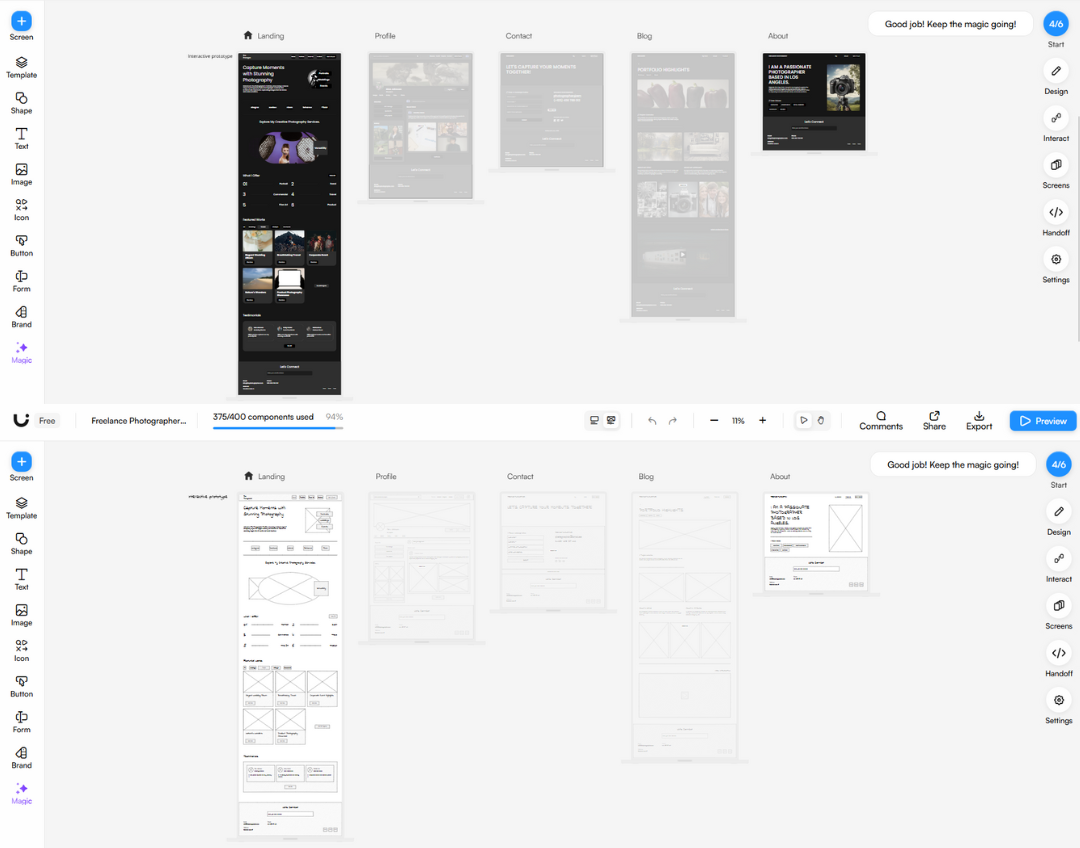 Then click on Generate my project and the platform will have your screen flow ready—both in prototype and wireframe formats.