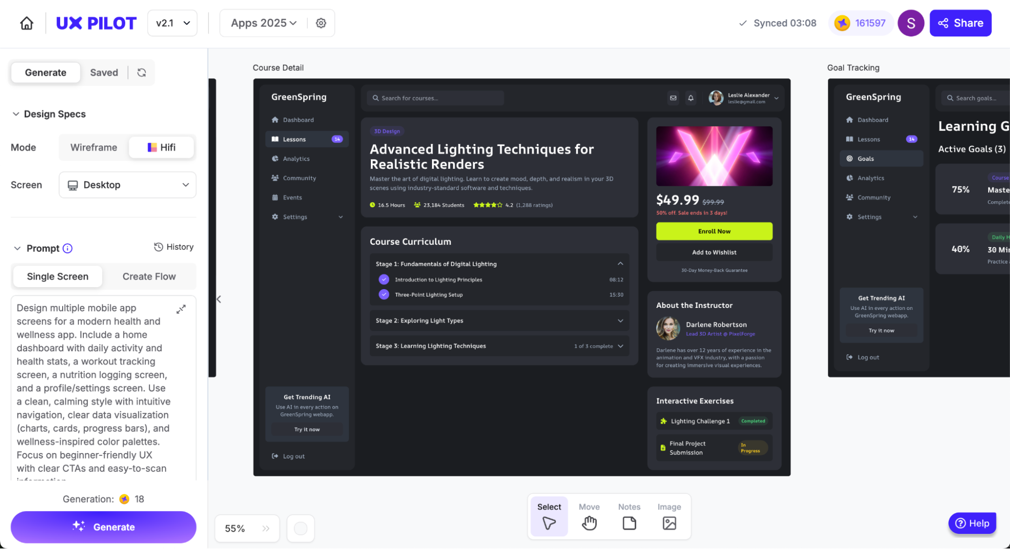 - Deep Design: Expand on high-fidelity layouts via UX Pilot's proprietary Deep Design model. It creates ready-to-deploy UIs and prototypes by accounting for recent design trends and conventions.