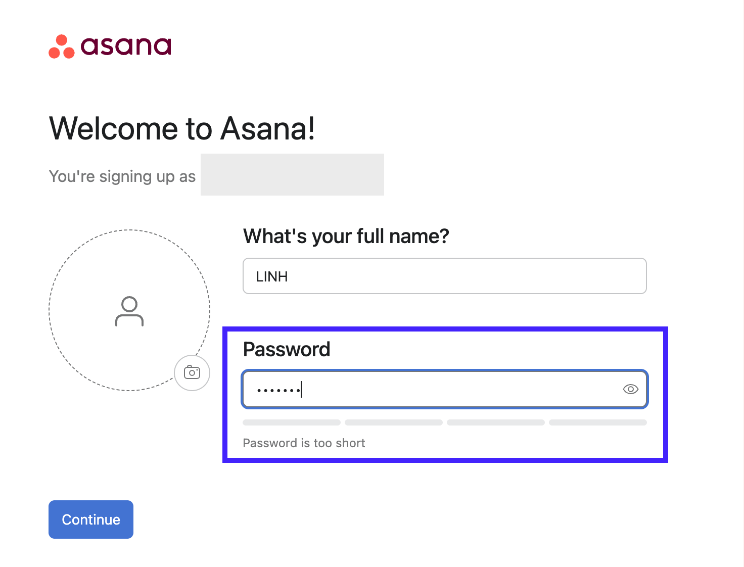 That's what Asana does when a new user sets up a password that's too short.