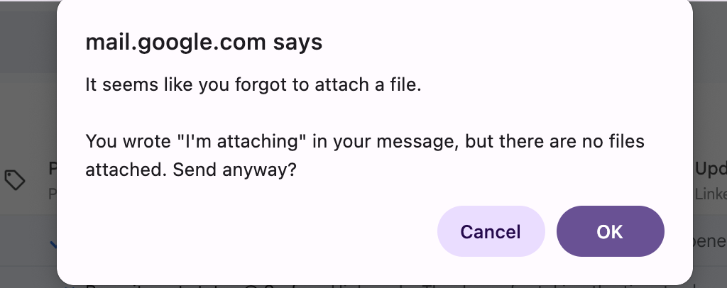 I can't count how many times Gmail has saved me from sending an email without the attachment I mentioned. When you write something like "I've attached the document" in your email body but forget to actually attach a file, Gmail catches it and asks, "It seems like you forgot to attach a file" before sending.