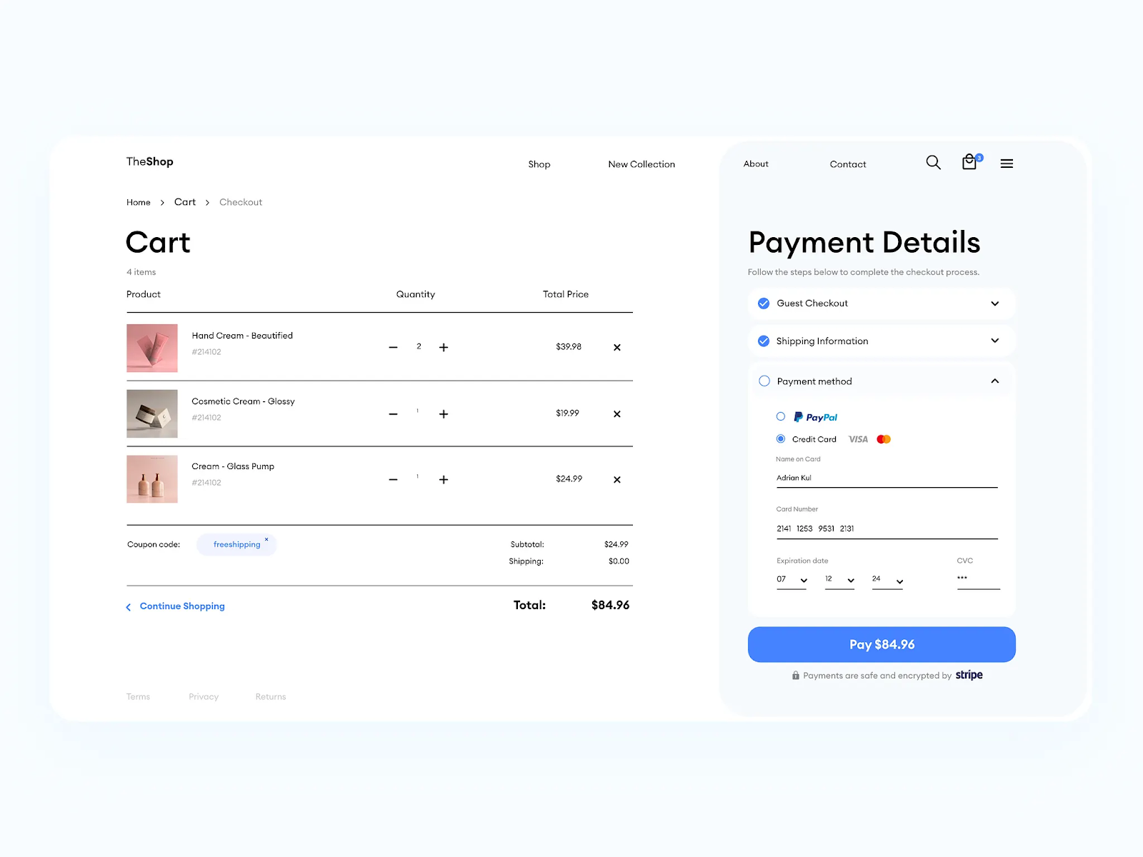 The checkout page below is a good example. It makes the process easier by showing the cart items on one side and the payment steps on the other: