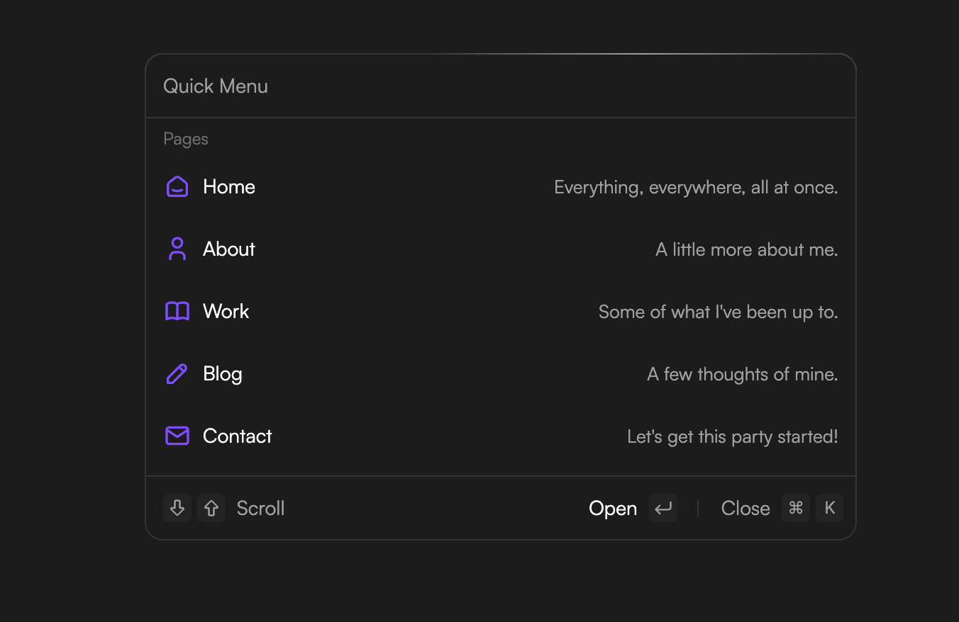 Here’s an example when pressing Cmd + K opens a quick menu, and you can move through each option (Home, About, Work, Blog, Contact) using only the keyboard.