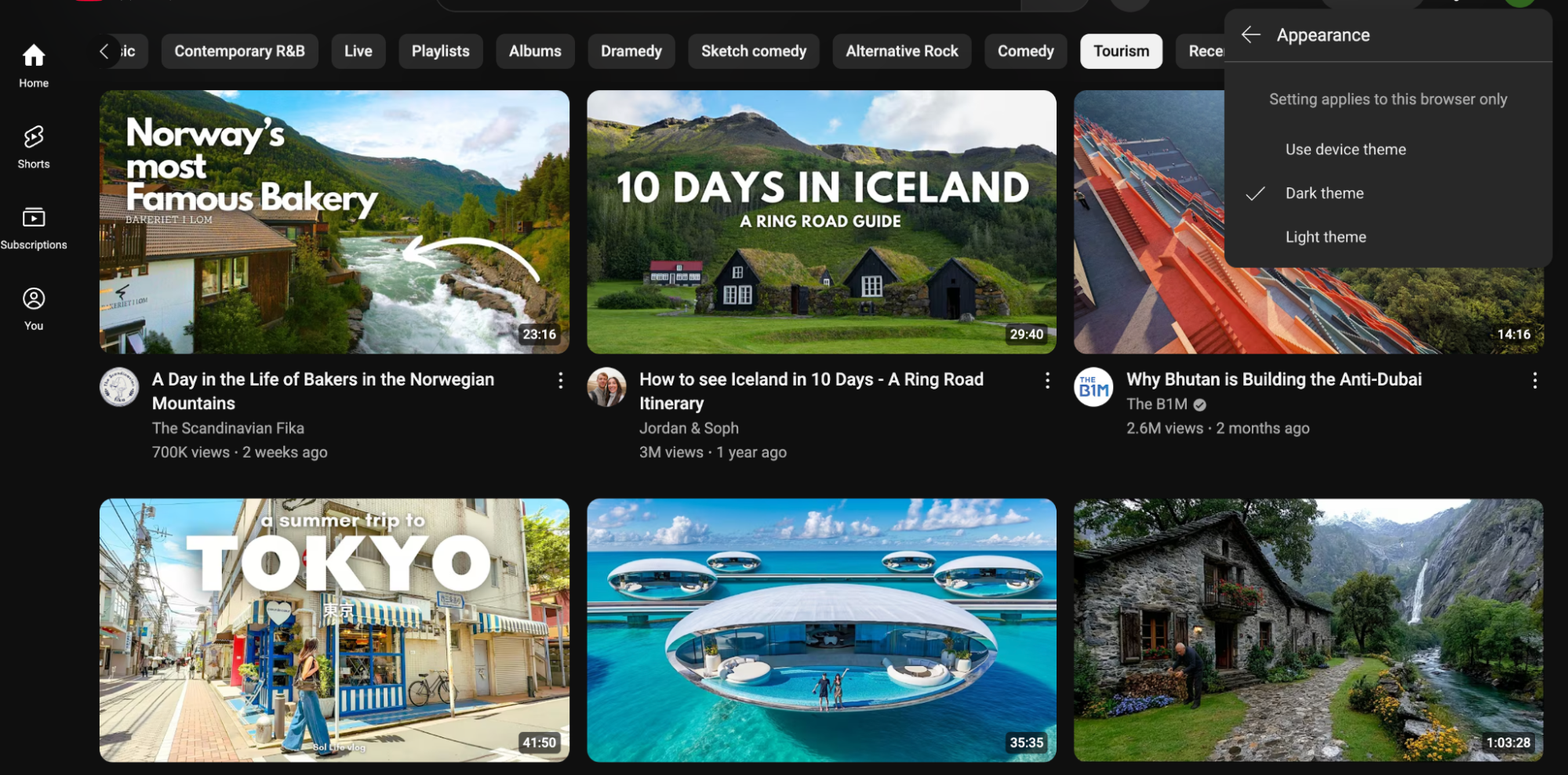 Here’s how it looks on YouTube. You can switch between light, dark, or system themes directly from the settings panel.