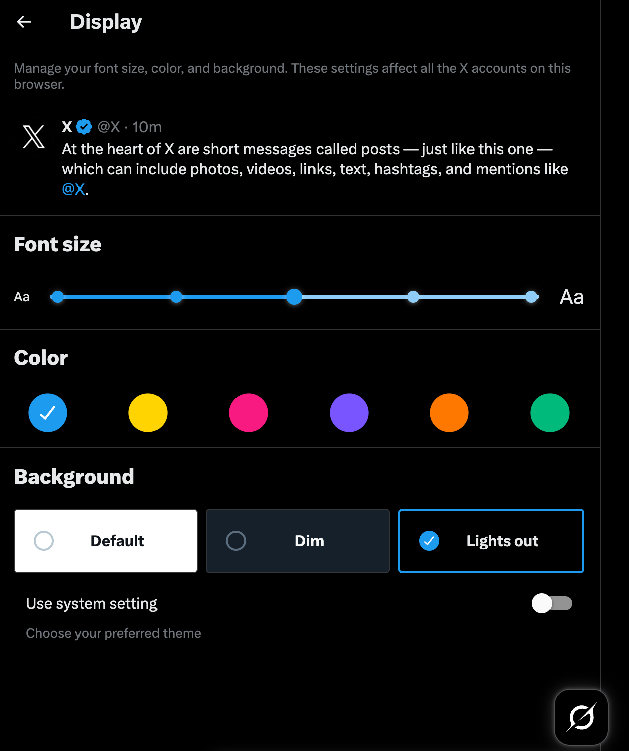 On X, you can take it further with options like “Dim” and “Lights Out.” You can also personalize the interface by changing highlight colors to blue, yellow, purple, or other shades.