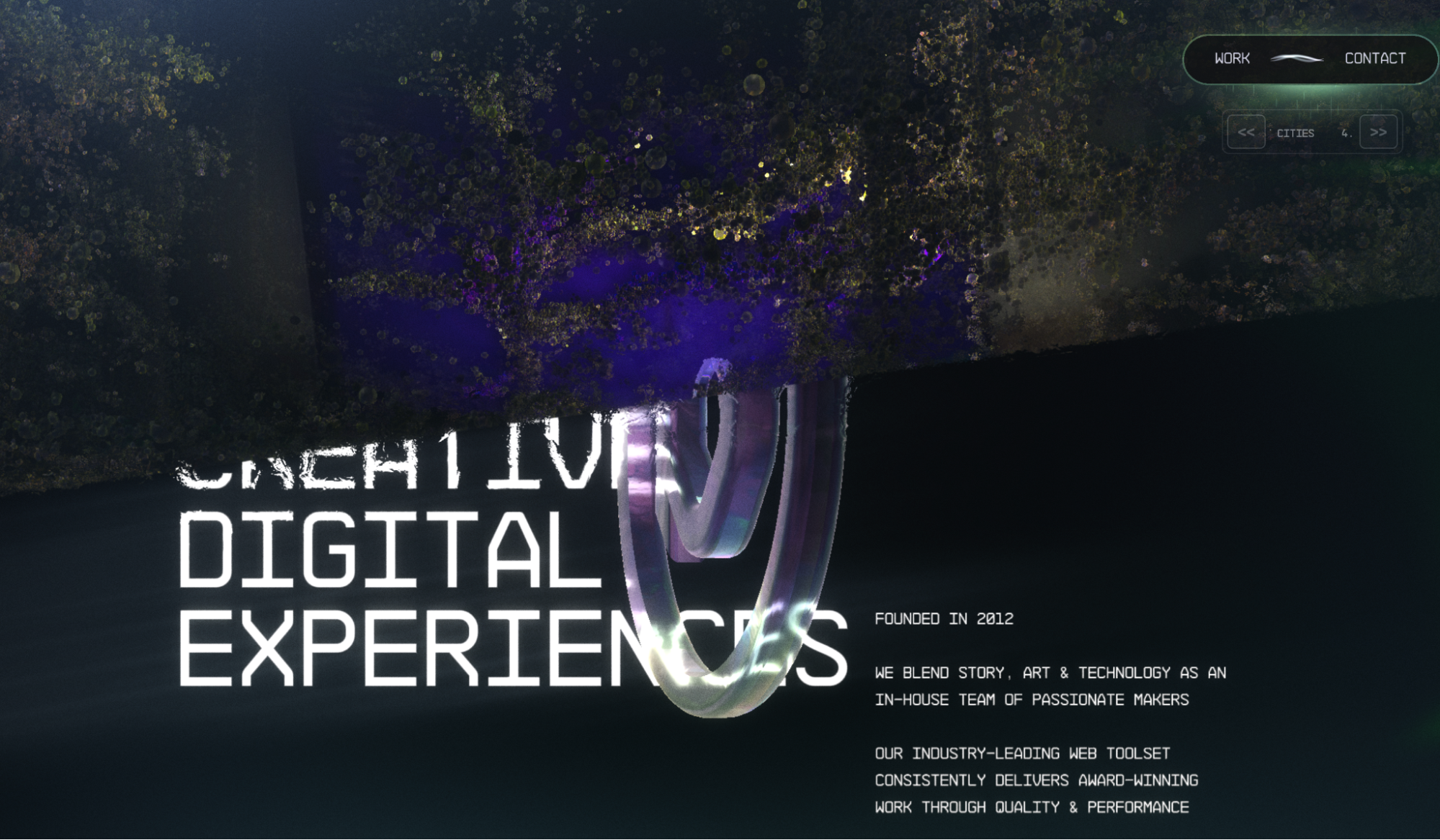 Active Theory is a clear example of this style. Their homepage combines a dark, futuristic interface with glitch-inspired transitions and kinetic typography.