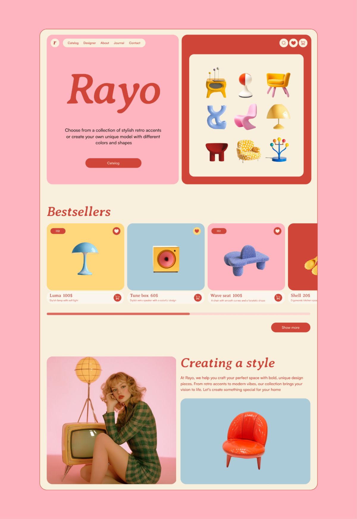 Here’s an example: a furniture site that leans into retro energy with pastel backgrounds, bold reds and yellows, and rounded illustrations that feel straight out of a mid-century catalog.