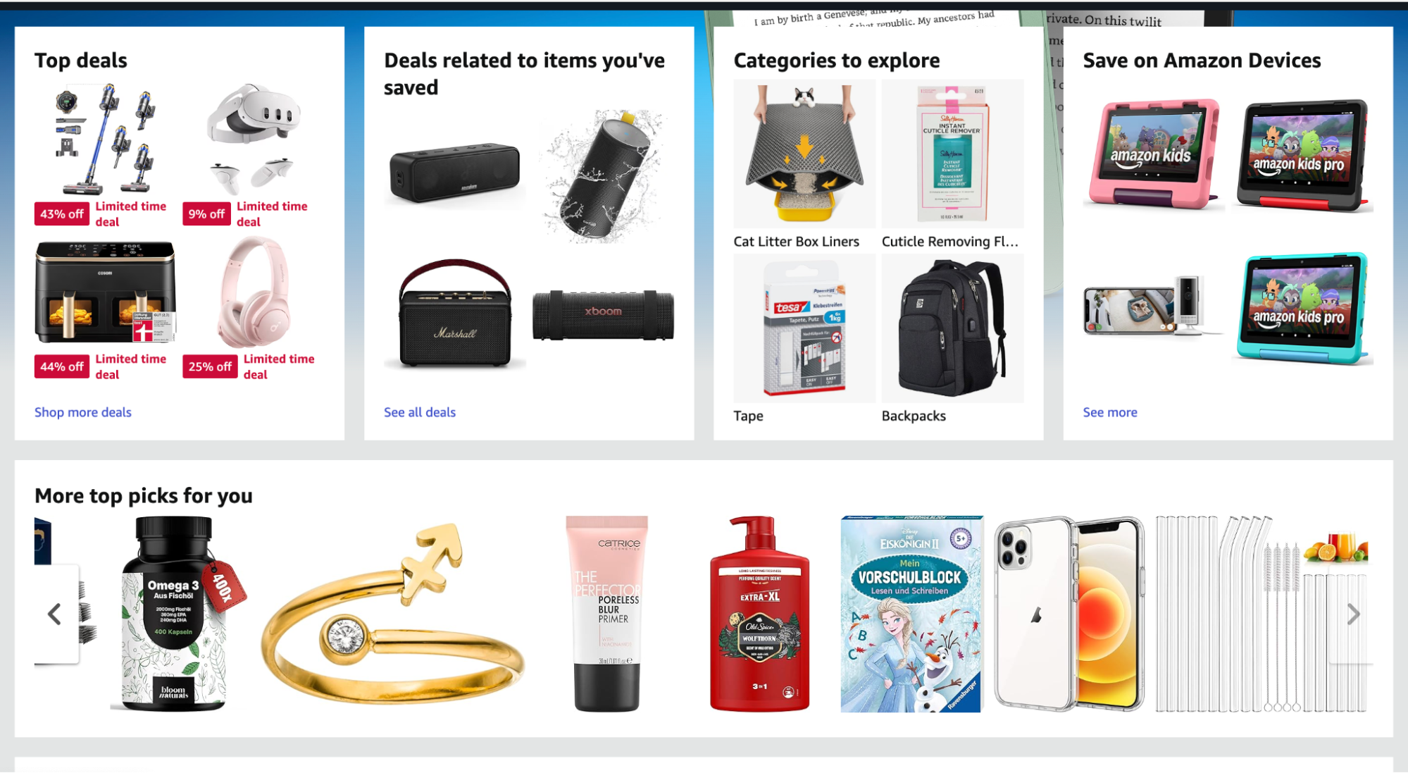 Personalized sections like “More top picks for you” or “Deals related to items you’ve saved” keep users coming back and reduce the time spent searching.