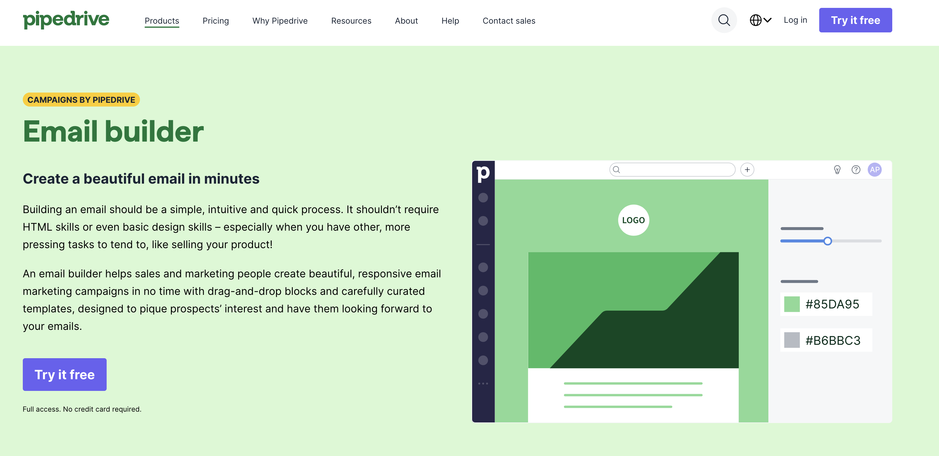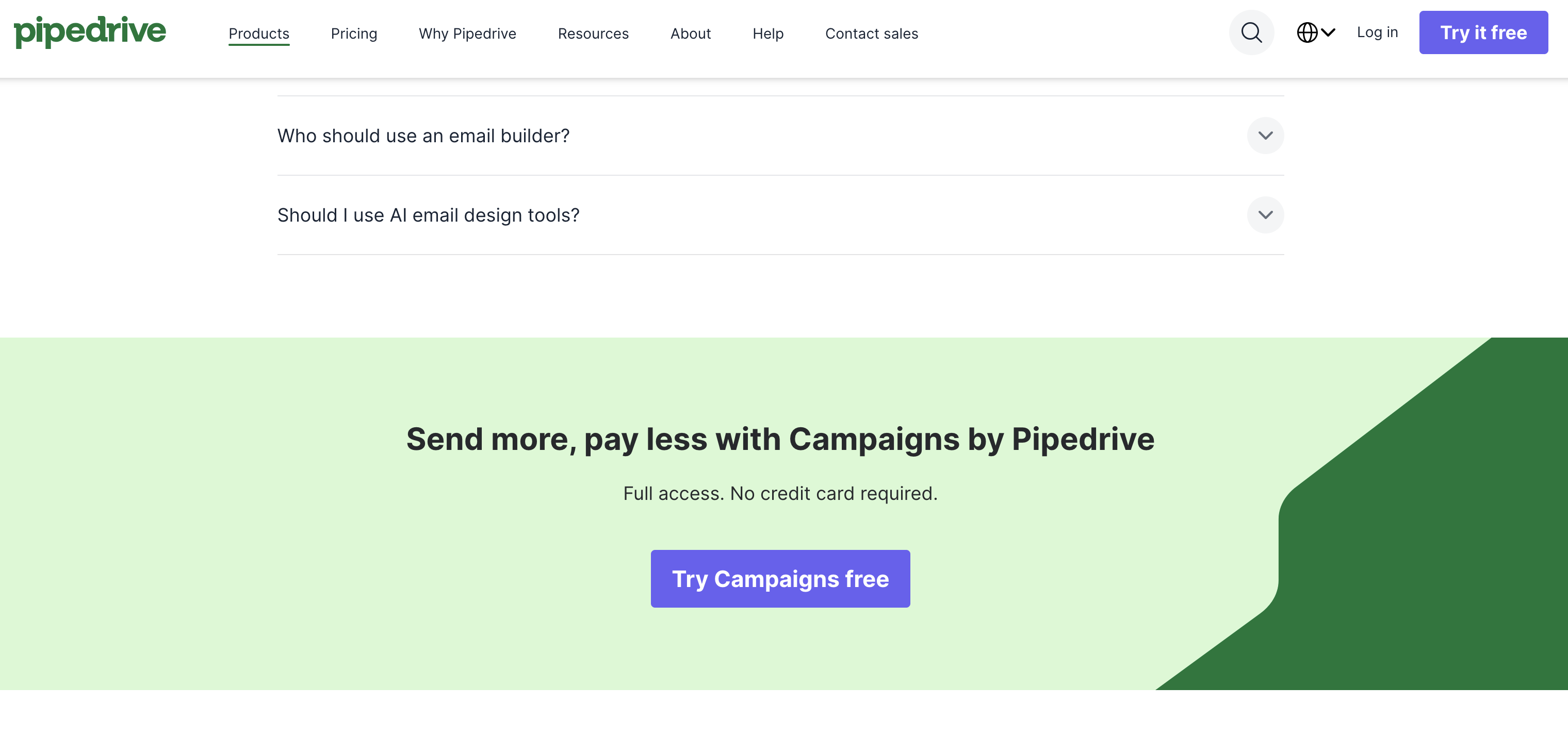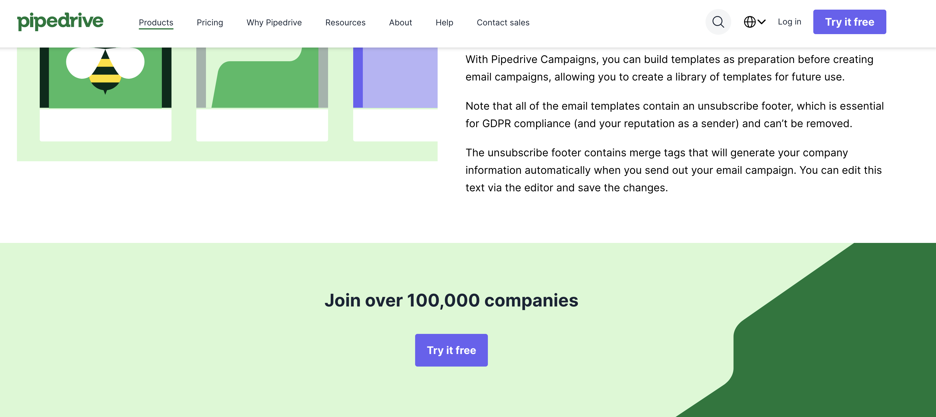 Pipedrive does this well in its product pages. When you open one, you'll see a visually distinct CTA in the header and another in the hero section.